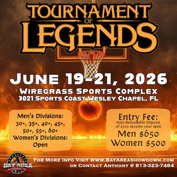 Bay Area Basketball Inc presents the Tournament of Legends. A 5 on 5 basketball tournament June 19-21, 2026, at Wiregrass Ranch Sports Campus of Pasco County