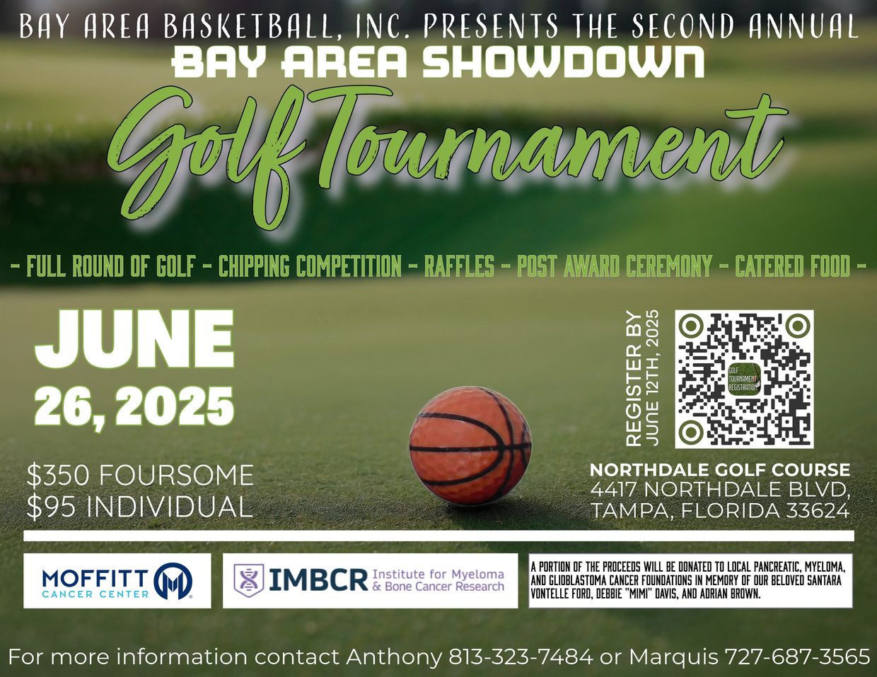 The second annual Bay Area Showdown Golf Tournament will be on June 26th, 2025, at the Northdale Golf Course located at 4417 Northdale Blvd. Tampa, FL 33624. It is paired with our annual Bay Area Showdown Men’s Basketball tournament. This is our 12th year hosting the basketball tournament, in which we will have a total of 50 teams from around the country competing to win a $15,000 prize June 27 – 29, 2025.